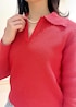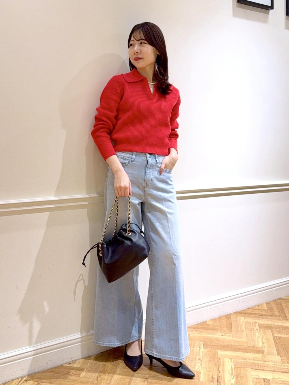 赤を主役にしたデニムコーディネートです☺︎︎ カジュアルな印象になるスタイリングでもパールのネックレスをプラスして女性らしい印象に◎ 短丈でスッキリとしたトップスにワイドシルエットのデニムを合わせてスタイルアップ効果も抜群です。