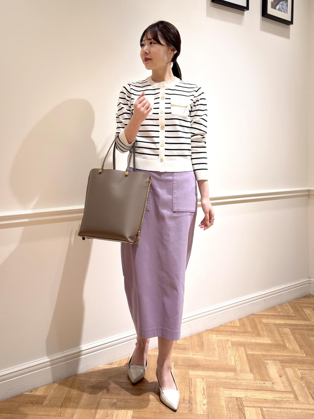 ジャストで着やすい生地感のカーディガンと 大人気のタイトスカートを合わせたスタイリングです。 ボーダーとラベンダーカラーで爽やかで春らしい コーディネートにしてみました☺︎︎ カーディガンは羽織りや一枚着の両方で使いやすいので 春夏大活躍間違いなしです♡ ぜひお試しください。