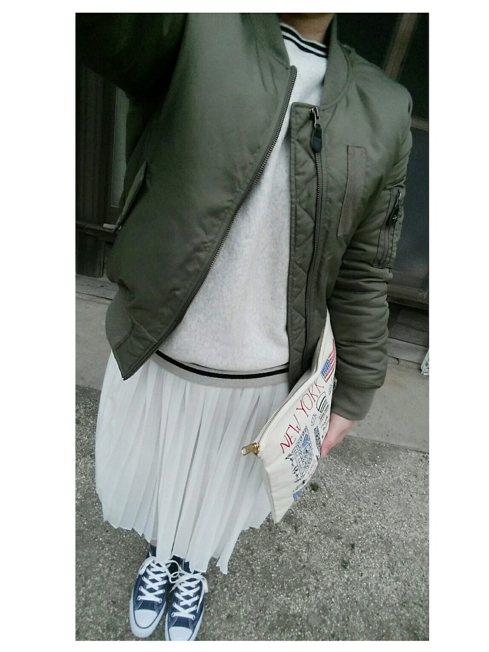 またまたコンバース、MA-1着まわし🙌 そろそろ暖かくなってきたし、中綿のMA-1はあと何回着れるか… メンズのchampionスウェットだけど女子っぽいコーデにしたかったので、プリーツスカートで軽めに春っぽコーデ🌸 BEAMSのクラッチはParisか迷ってNew York🗽 カジュアル系合わせやすくてよかったかも! 海外行きたいな~!