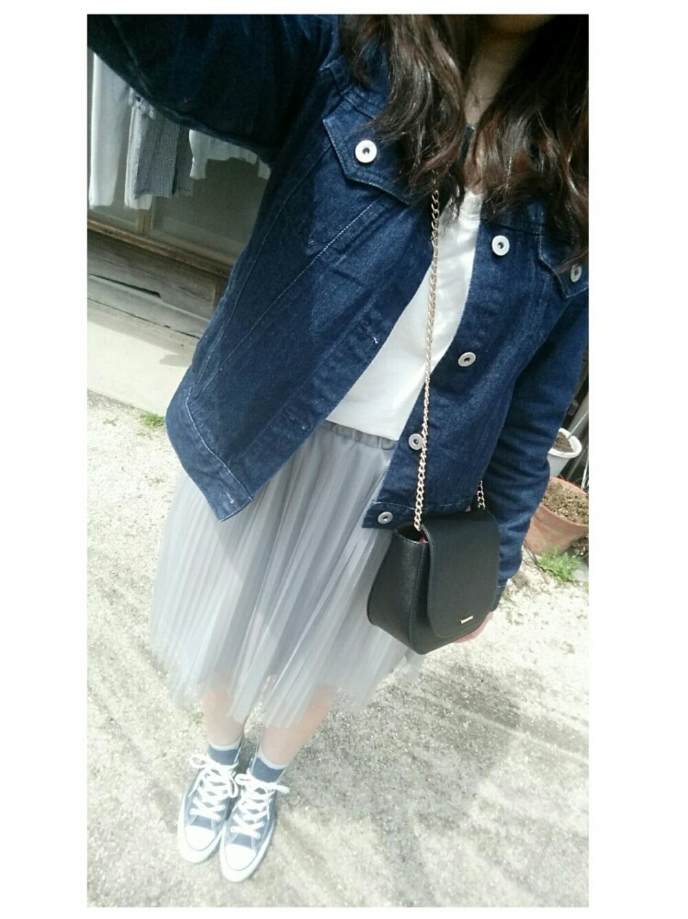 シフォンのプリーツにシンプルなVネック白T合わせてカジュアルコーデ! このスカート、セールで1500円くらいで即買い。色もつぼです💓 この時期の上着は基本Gジャン💡 コートはもう着れないし、カーデは薄い… そんなときはGジャン!って感じです😂 靴は野球見に行くから歩きやすくコンバースハイカットにしました👟