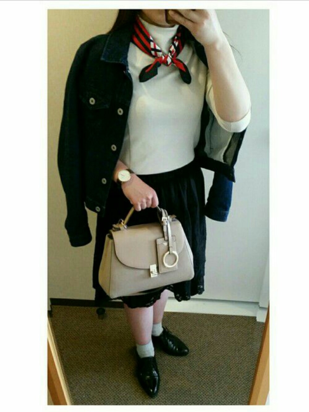 GW二日目! 友人と久しぶりの再会! 大人めに黒レーススカートとシンプルなプチハイ七分袖の白トップス👕 今日もやっぱりGジャンです! スカーフ巻いてポイントに⭐ フレンチテイストなコーデになりました!