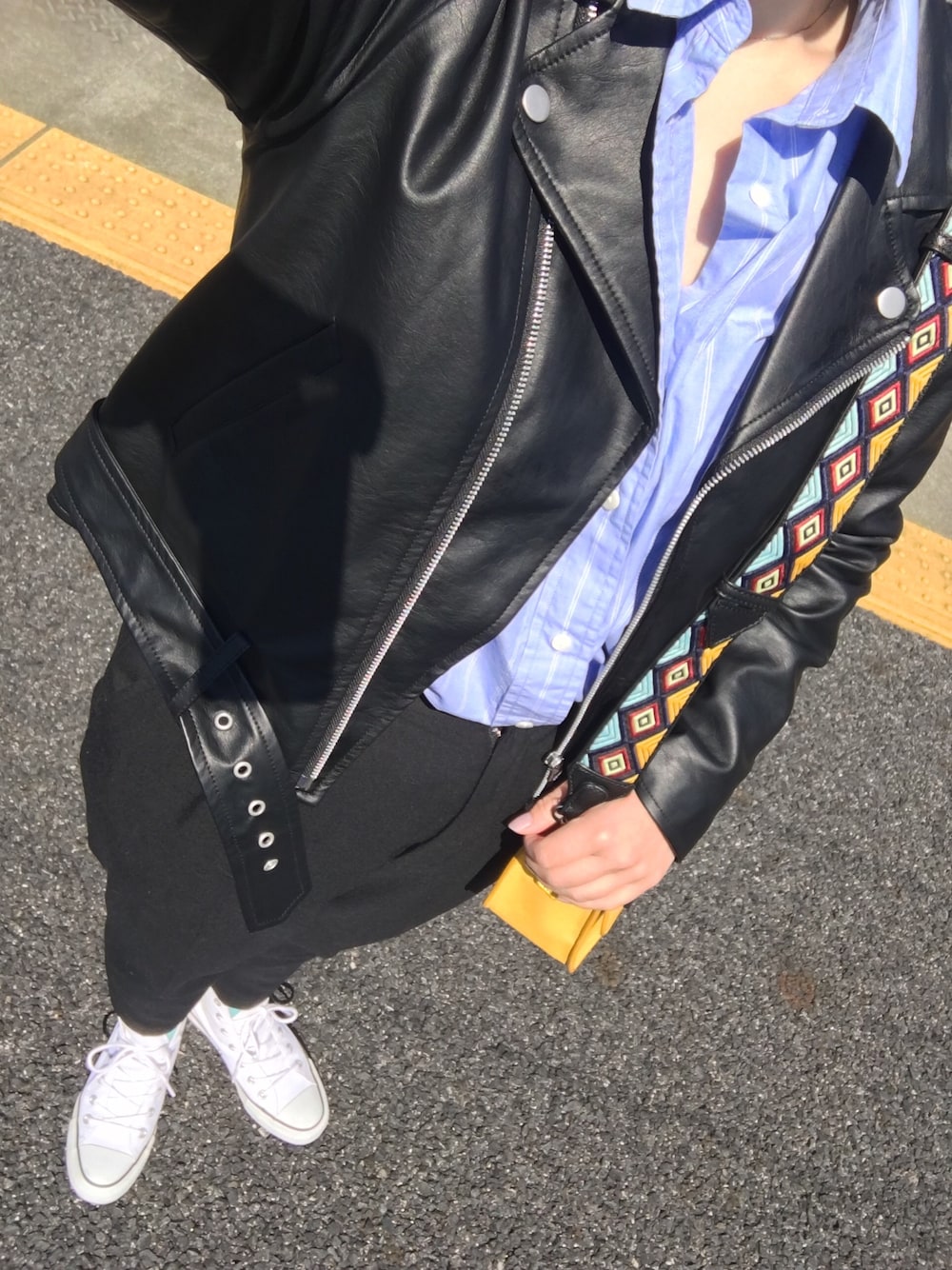 おはようございます! いいねありがとうございます(*^^*) 昨日のライダース着回しです! UNIQLOのオーバーサイズシャツにパンツ合わせました! zaraのバッグ太ベルトの刺しゅうがお気に入り!
