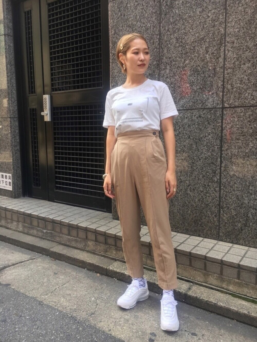 ホワイトとベージュでまとめたシンプルコーディネート ハイウエストパンツにTシャツをインすることですっきりとしたシルエットに^^ TシャツはMM6のもの♪