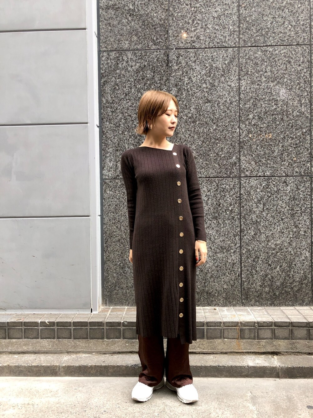 タイトなワンピースに同系色のパンツを合わせて縦ラインを意識したコーディネートに仕上げました。 ブラウンは今年らしいお色なのでオススメのカラーです◎