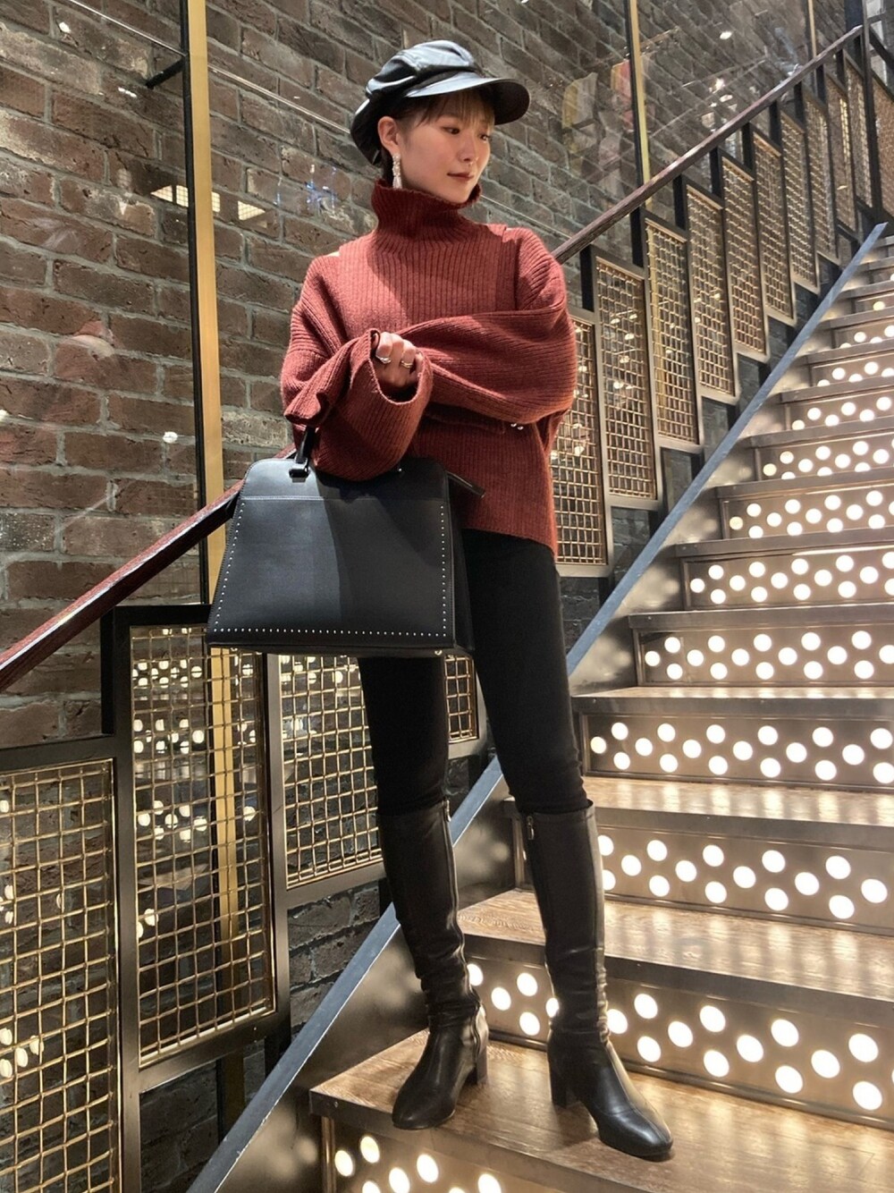 カラーニットをポイントにレザーを中心にブラックでまとめました。