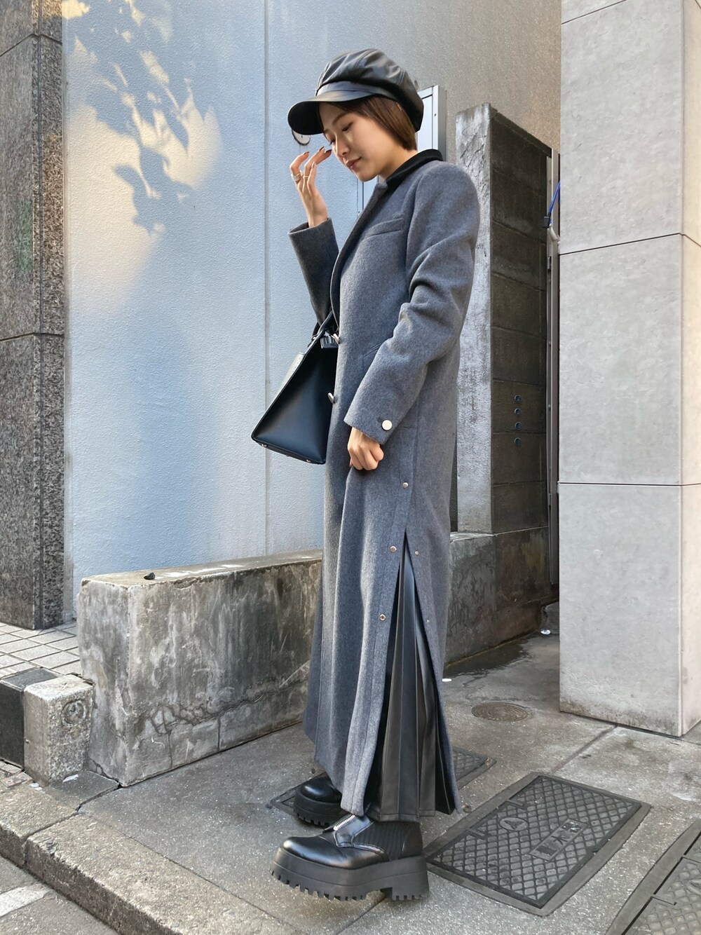 フルレングスのコートはサッと羽織るだけでキマる万能アイテムです!サイドのプリーツはトレンドのフェイクレザーを使用し、ストレッチ性もあるので足さばきもラクです^^
