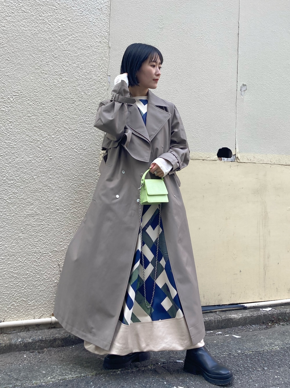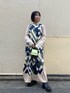 柄が目を引くワンピースは同じ丈感のトレンチコートを合わせて大人のワンピーススタイルに。ノースリーブワンピースはシアーアイテムをレイヤードすれば春先からも着用が出来るのでおススメです◎
