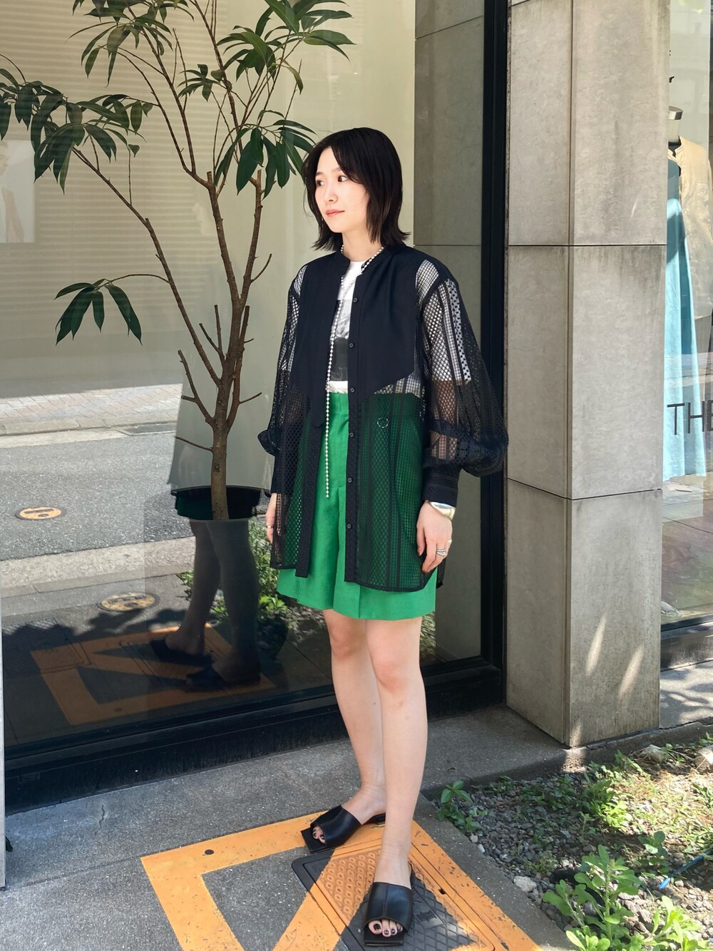 レースブザムシャツは一枚で着るのも良し前を開いて羽織りとして使うも良しの万能アイテムです◎ トレンドのグリーンパンツを合わせると一気に今年らしい装いになります。