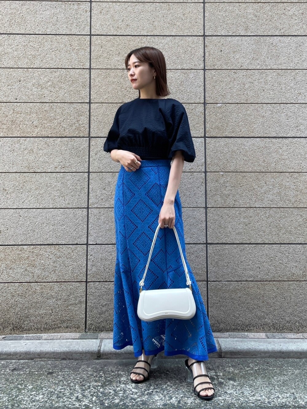 シンプルながらもバックコンシャスなトップスが目を引くコーディネートにしました。 スカートは足元が透けているのでほど良い抜け感がでます◎