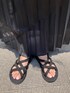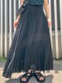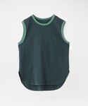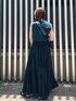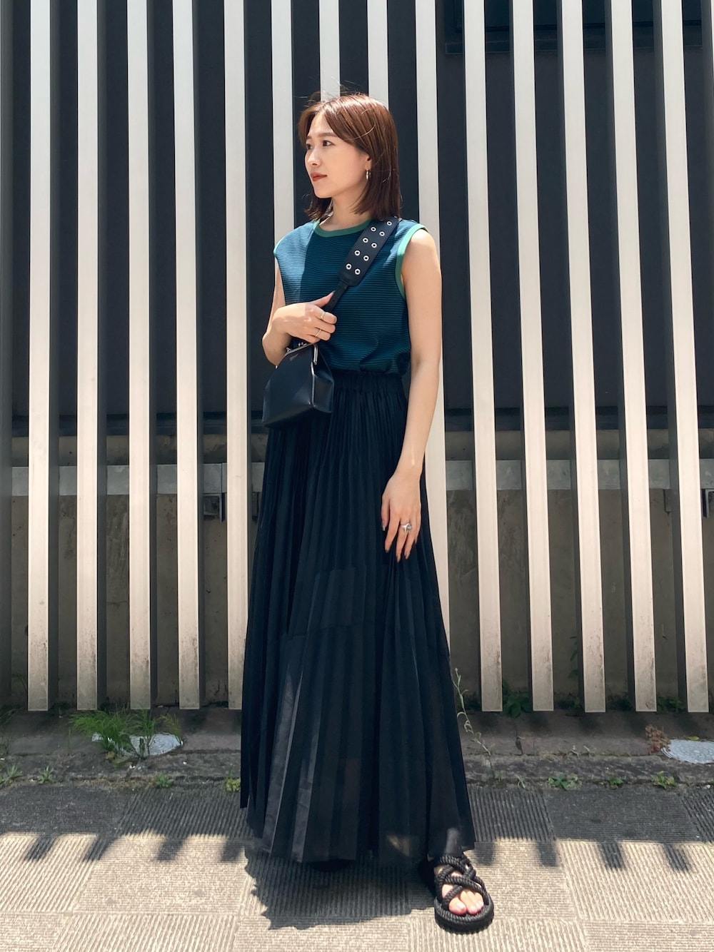 グリーンのボーダータンクを合わせたブラックコーデ。 プリーツスカートは透け感があるのでロング丈でも重くなりません。