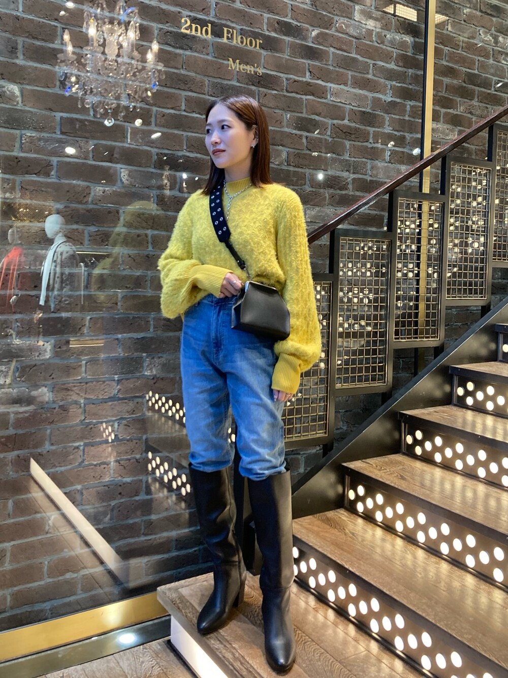 袖のボリュームが特徴的なゆったりシルエットのニット。 ショート丈なので小柄な方もバランスを取りやすいサイズ感です◎ 小物をブラックでまとめて辛口に仕上げました。