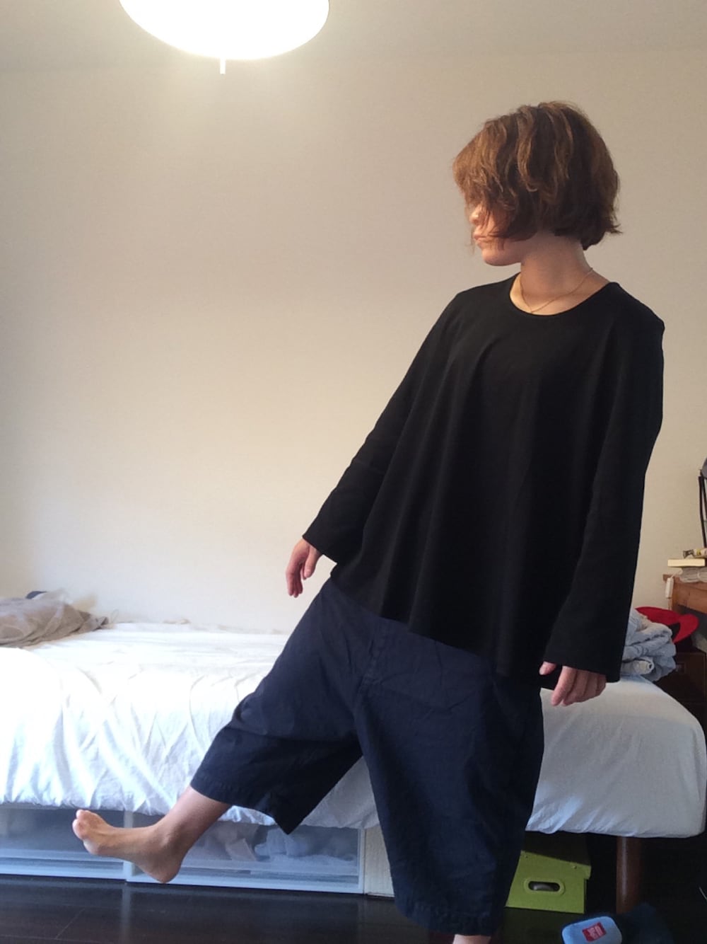 ka na taのカットソーとdulcamaraの定番の染めコットンペンギンパンツを合わせました。