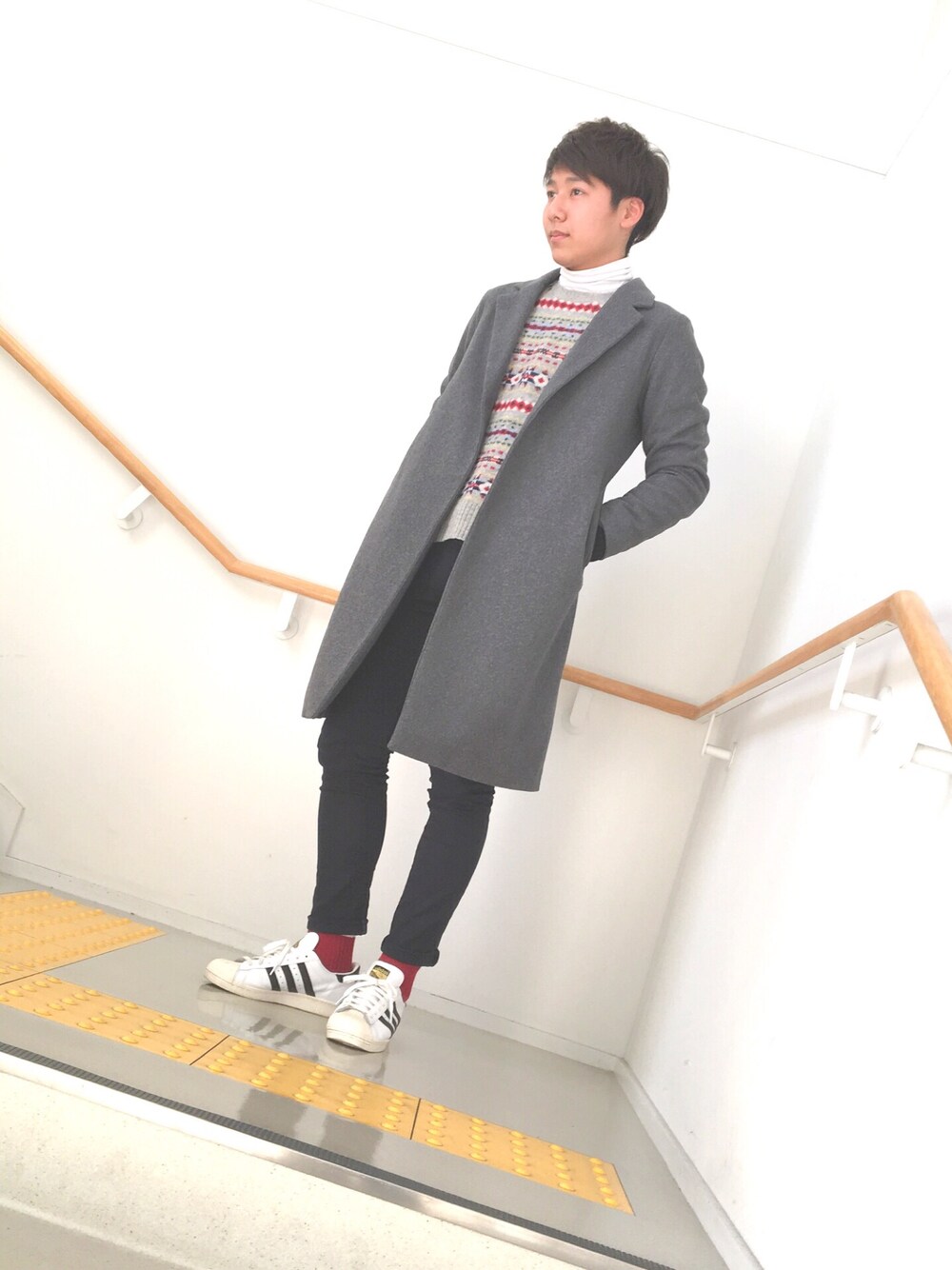 チェスターコート初チャレンジです! 中の総柄ニットと赤ソックスで可愛さを出してみました(^ ^)