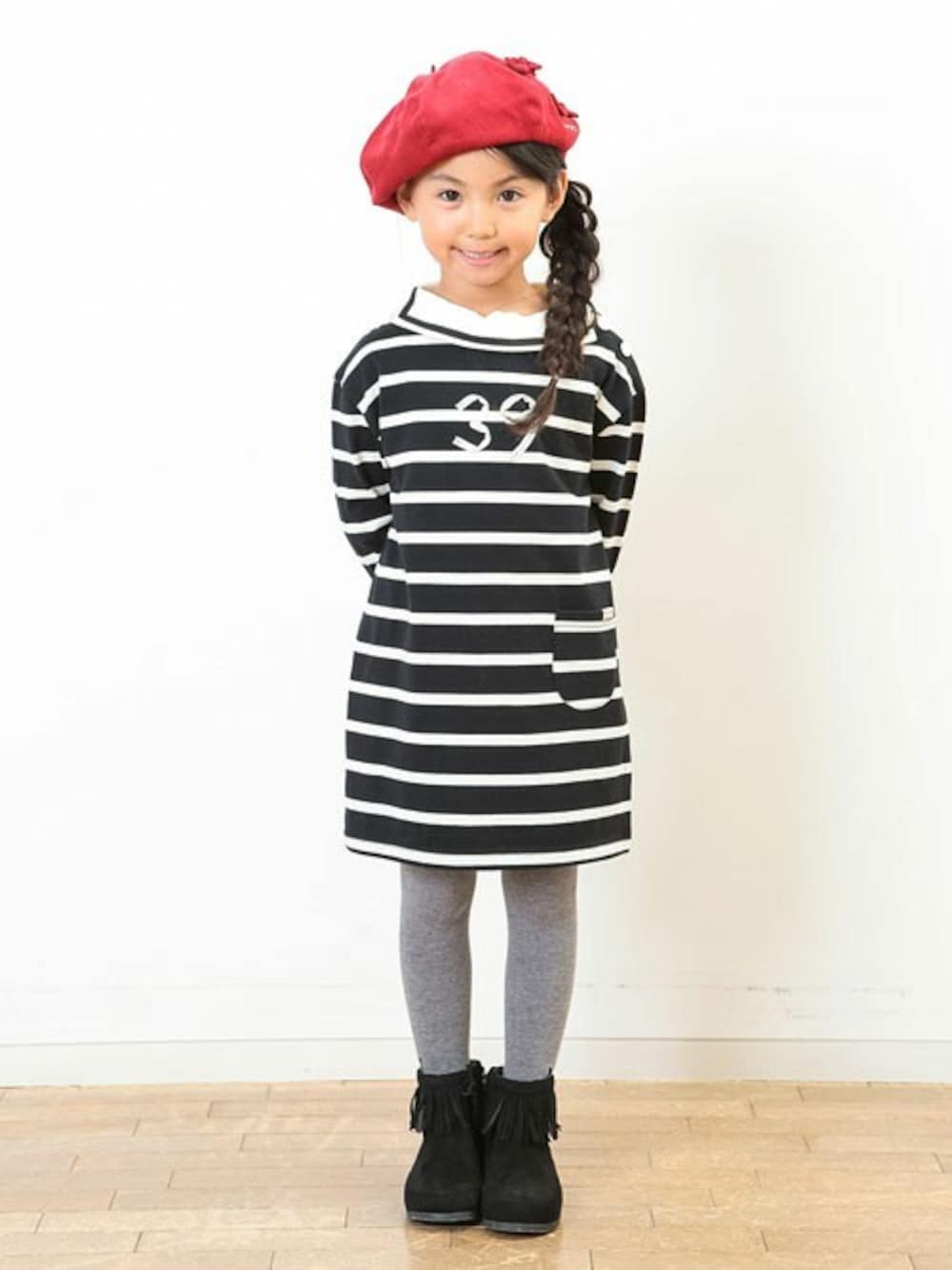 ベレー帽はおリボンのモチーフも付いていてお洒落です。 素材も細めのコーデュロイを使用・カラーも秋色ですね。 ボーダーのワンピは襟元がセーラータイプでかわいいです。 ナンバリングのアップリケもポイントです。 フリンジのショートブーツは定番人気で 内側のジップ式で穿かせやすいです。