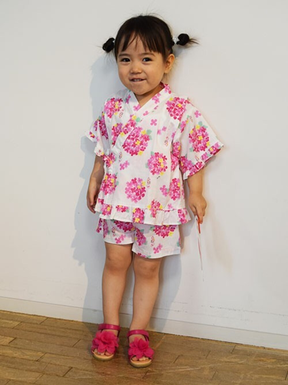アジサイ柄の甚平です。 甚平は80~110cmまでの4サイズ。 甚平オールは新生児ベビーのFREEサイズを ご用意してます。 色合いも合うサンダルは甲の部分もマジックテープで 調節しやすいです。