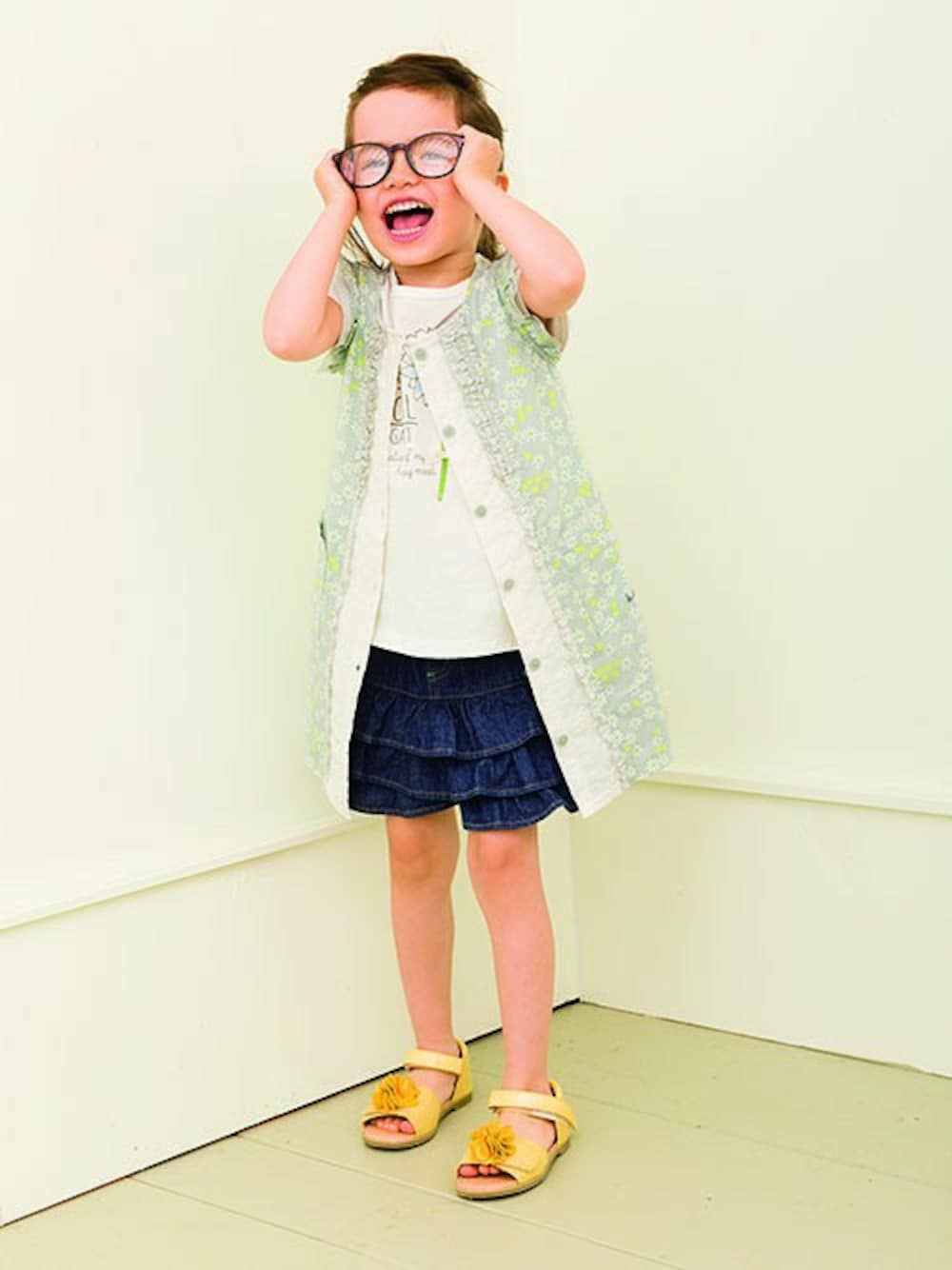 前空きで着れるワンピースはマーガレットのお花の 総柄です。センターのレース使いもやさしい雰囲気を 与えてくれます。 ボタンをしめても落ち着いた雰囲気がでます。 インナーのTシャツもマーガレットプリントです。 お袖のデザインもかわいいですね。