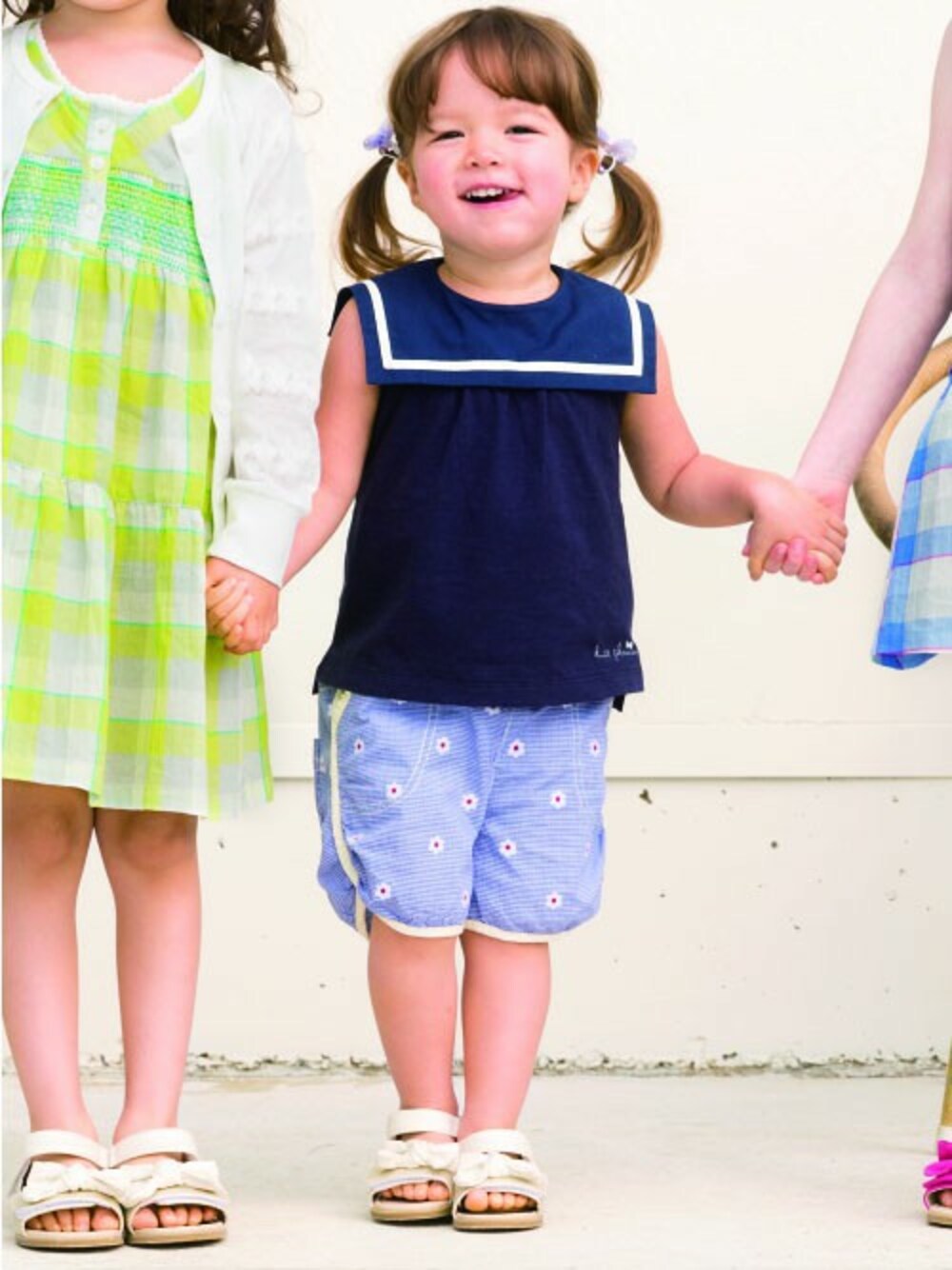 セーラーデザインの襟がお洒落なTシャツはシンプルな デザイン、お色でご用意しております。 (zozo店は100cm~の取扱い) ギンガムのショーツはお花柄もマルチプリントでスポーティな デザインもトレンドです。 着用:90cm