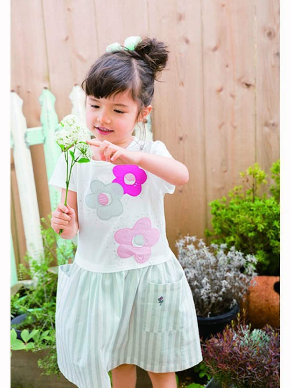 お花のアップリケのかわいいワンピースです。 淡いストライプのスカートとの相性もよく涼しげ な雰囲気が良いです。。