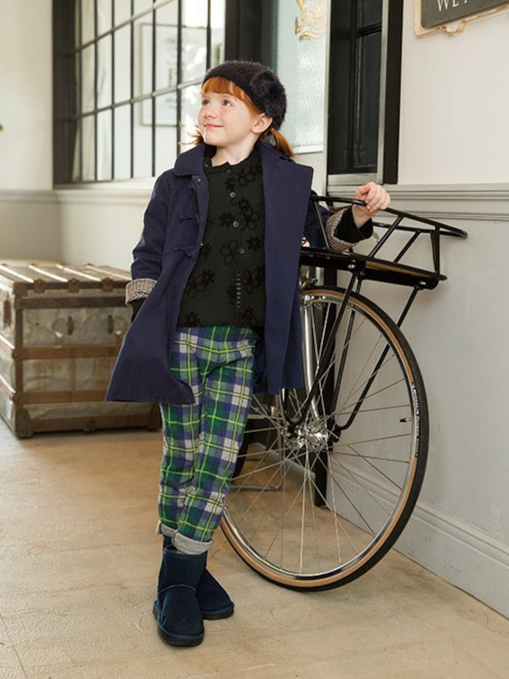 袖の折り返しとリボンモチーフのボタンが特徴な トレンチコート。(他ベージュあり) チェックのパンツと合わせるとUK風なスタイルに。 大人顔負けのお洒落さですね。