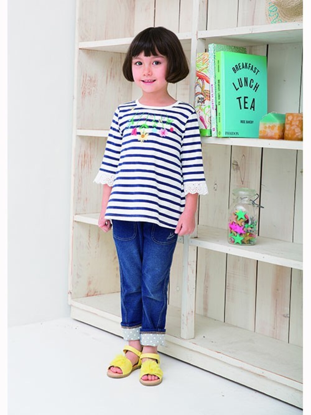 裾広がりなボーダーチュニックTシャツ。 胸のお花たちはすべて刺繍です。 カラフルで引き立ちますね。。 七分の袖もレースで女の子らしさが アップします。