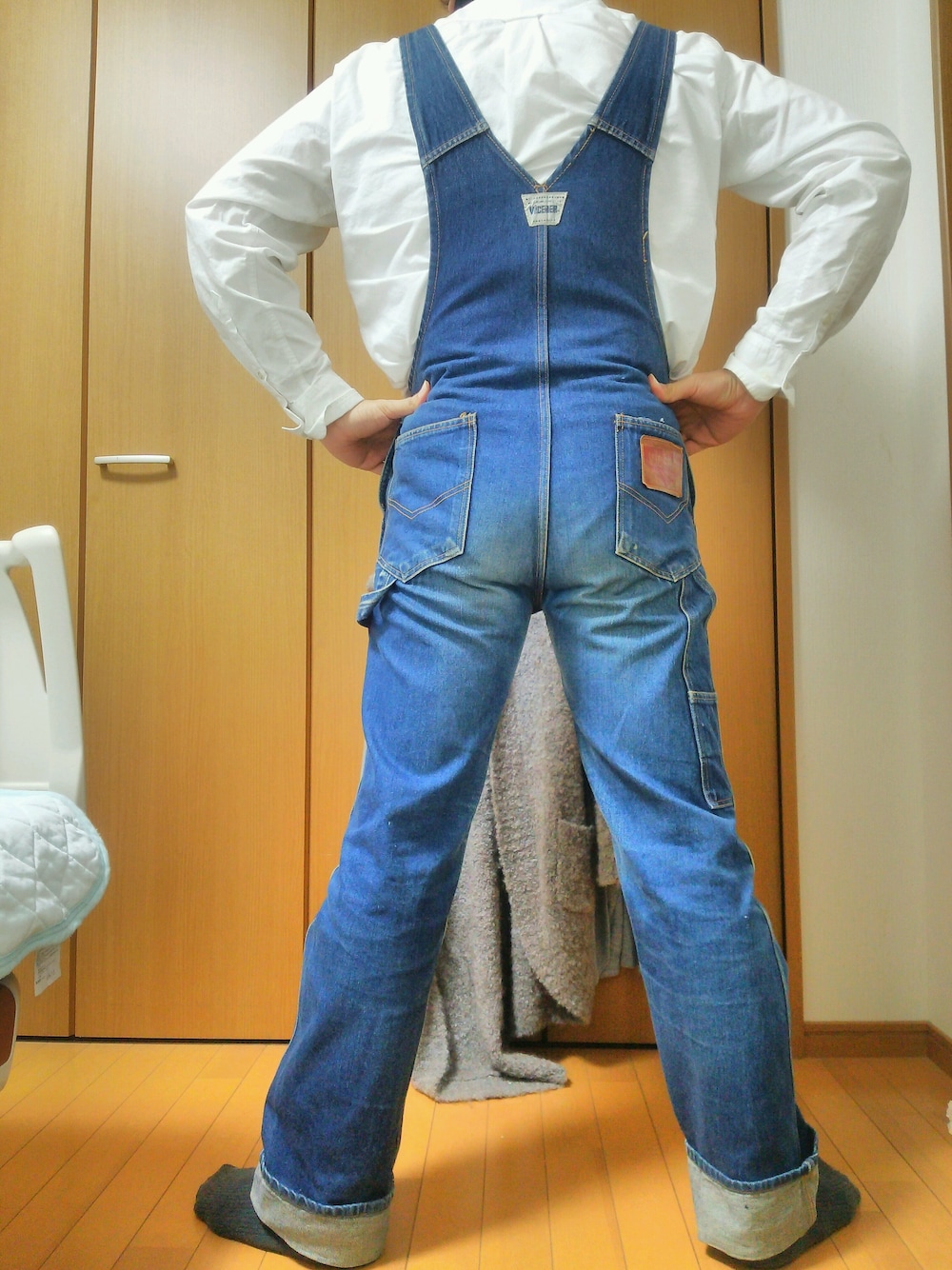 VICERERの70'sオーバーオール(34インチ)のバックスタイル。流石に70年代のオーバーオールらしく、右ヒップポケットにVICERERのロゴが入ったレザーラベルが付いています。オーバーオールの下に着ているのはGENUINE CLASSICSの白シャツ。 2015年4月15日(水)20時45分頃、自宅にて撮影。
