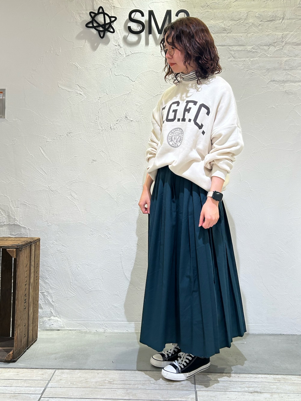 ゆるっとシルエットがかわいいスウェット プリーツスカートと合わせて、少しスッキリシルエットを意識しました。 どんなコーデにも合わせやすい形と色で、 これからの季節重宝間違いなしです!