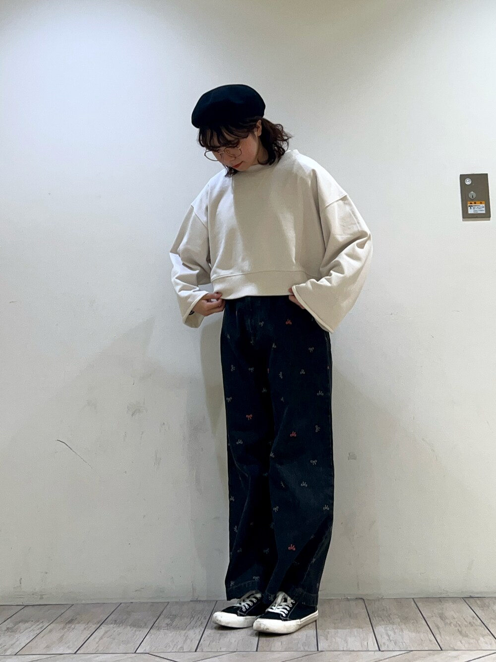 赤いリボン柄がワンポイントのデニムパンツ🎀 ゆったりはしていますが、下に落ちるストレートパンツなので、細見え&足長効果抜群です! よりすらっと見せるため、ショート丈スウェットと合わせました!