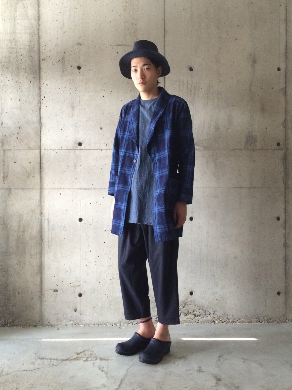 BronteのハットにNicheのインディゴチェックガウンコートをコーディネートしてみました🙂