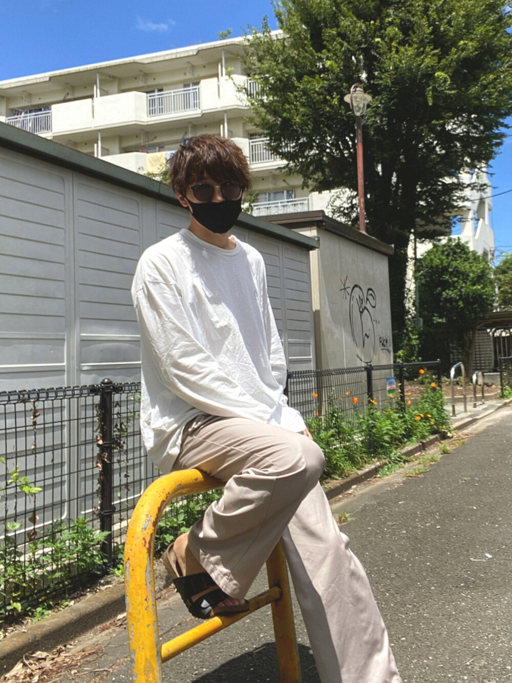 夏でも綺麗に涼し気のあるコーデにしてみました😄👕 ★今日のコーデ★ バックプリントの入っているロンTと、ベージュのパンツを合わせました!😆