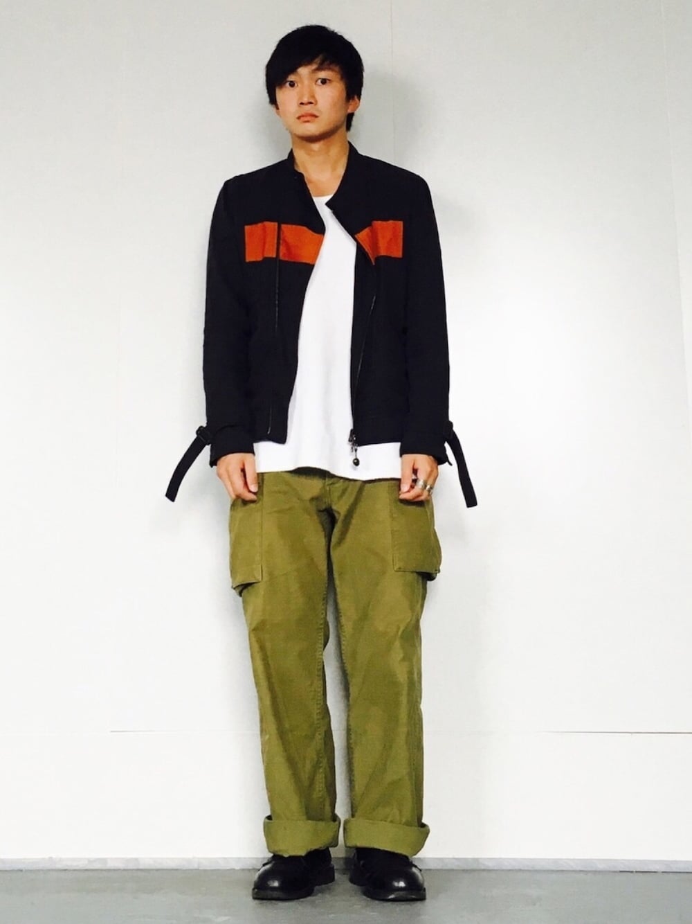 ブラック系のブーツを着用したメンズの春コーディネートの1枚目の写真