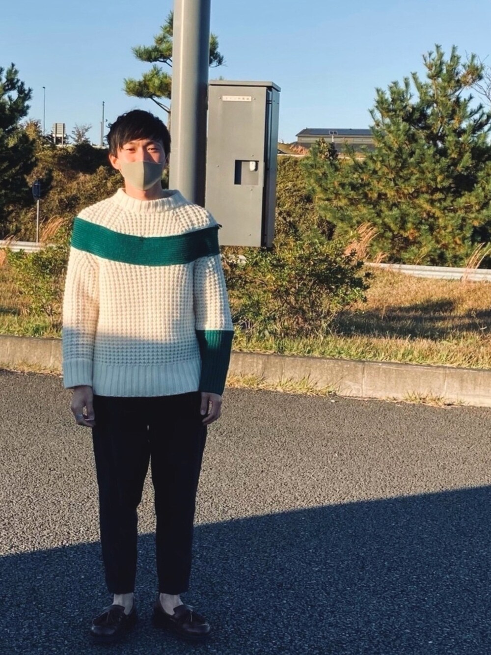 ホワイト系のニット/セーター、ブラウン系のローファーを着用したメンズの冬コーディネートの1枚目の写真