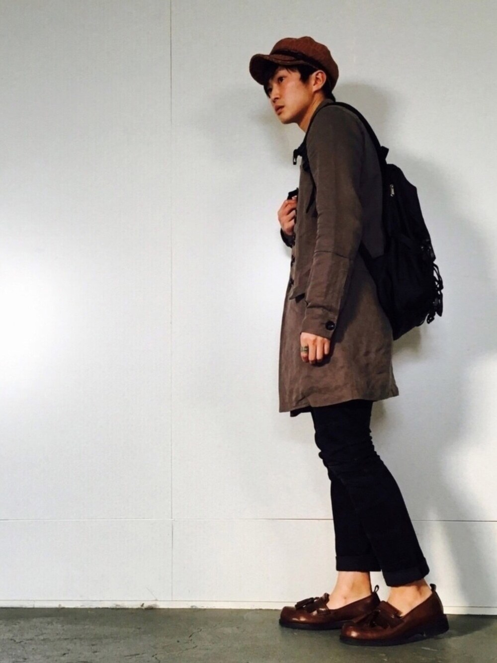 最近この組み合わせにハマってます 久しぶりに被ったオレンジ色キャスケット 春に最適の薄手のトレンチ 愛用してるユニクロのバックパック 渋い色のタッセルローファー