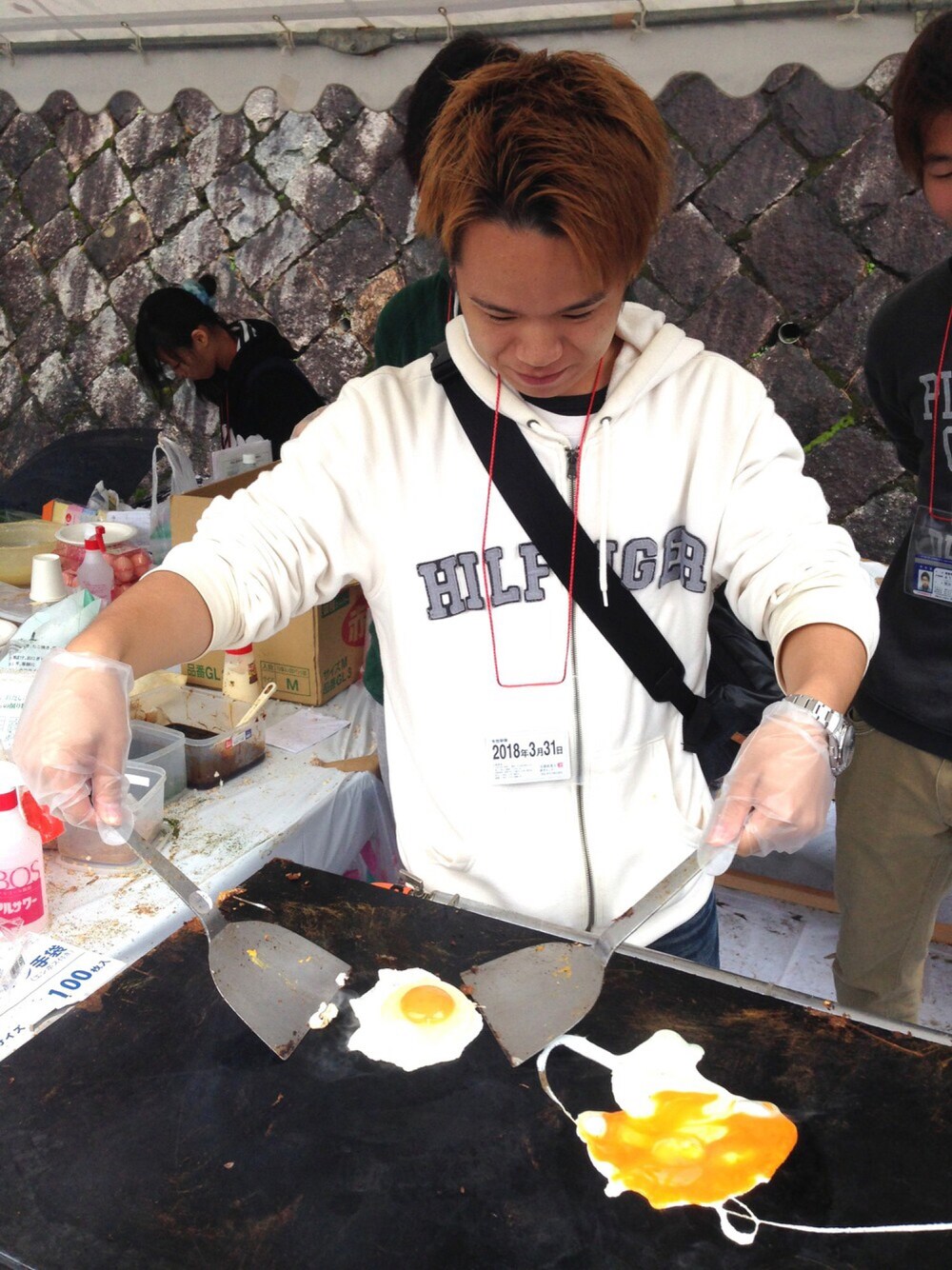 売店でのあまの。 目玉焼きを白パーカーで果敢に焼き上げているのがポイントです! #amashotime
