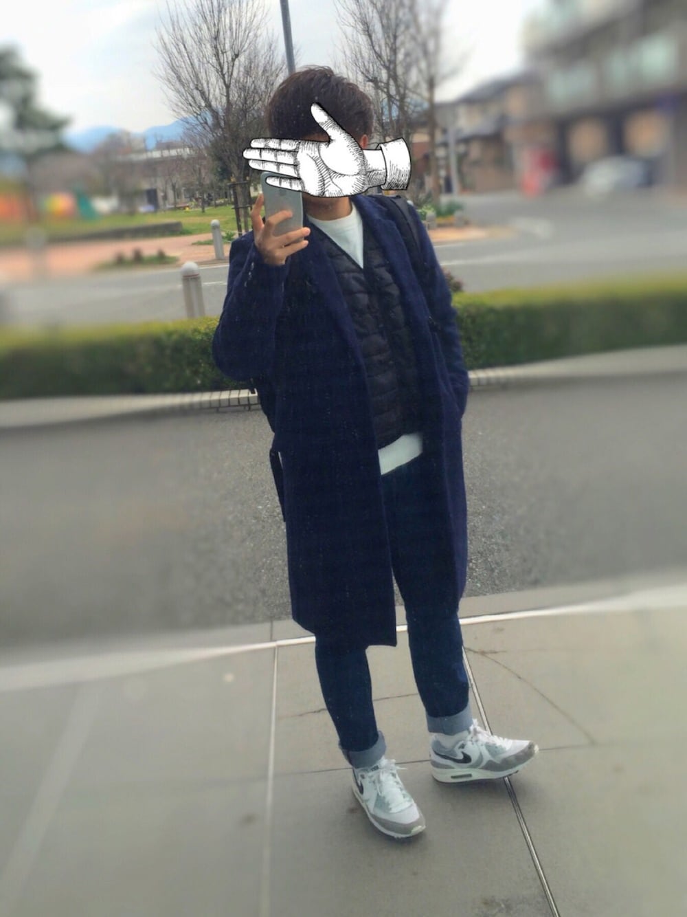 お久しぶりの投稿です🙏🏻🙏🏻🙏🏻 🚶🏻紺チェスターコート 🚶🏻白ニット 🚶🏻ダウンベスト 🚶🏻細めのジーンズ 🚶🏻灰色×白AIRMAX よかったらフォローお願いします。
