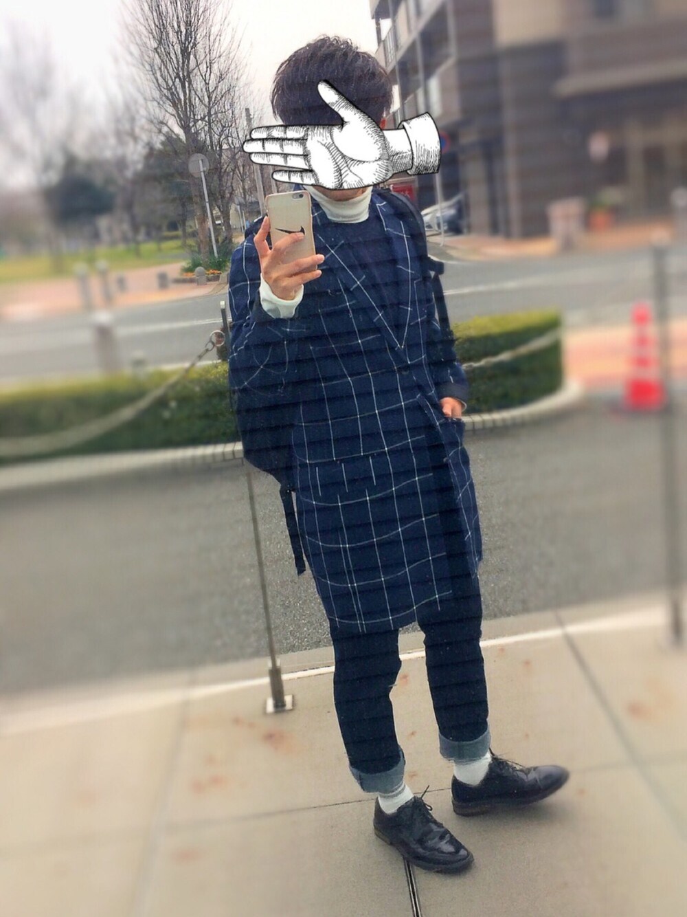 撮り溜めパート2です✨ 🚶🏻チェックのチェスターコート(春用) 🚶🏻白のタートルネック 🚶🏻紺T 🚶🏻ジーンズ 🚶🏻黒の革靴