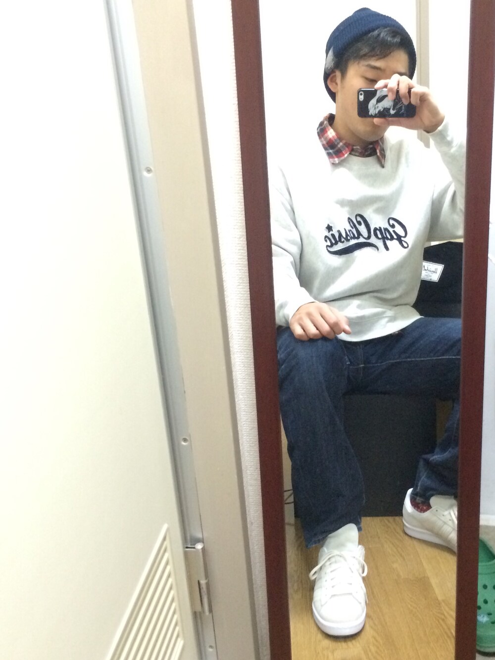 赤いチェックシャツ チラ見せ赤い靴下