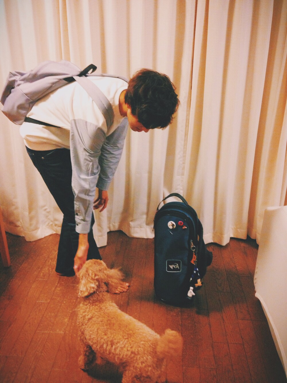 寒くなりましたね!僕は花粉症の季節です!辛いです! いよいよ秋服の出番です( ´ ▽ ` )ノ こんばんは。 今日はピックアップタグのバックパックを使ったコーデです。 グレーのバックパック、今年の夏に買って、WEARにもちょくちょく登場させてます。 さてさて、写真下の方に茶色い毛むくじゃらがいるのにお気付きの方、 話が早いです。笑 大きいですが、こやつはトイプードルです。 僕の1番の友達のラムネです。 もう10年ほどの付き合いになるのですが、どうもこいつは僕のことを飼い主ではなく、友達か遊び相手くらいに思っているようで、服従の意が全く見られません。そして家族以外には本当にごく少数の人にしかなつきません。 それでも、かわいいんです。 たまに家に帰ると、飛び付いてくるんです。 いつもは噛むくせに、その一瞬だけは撫でると喜びます。笑 犬というよりは、人間みたいなやつです。 すぐスネたり、喜んだりします。 バックパックの話からはそれましたがこんな感じです。