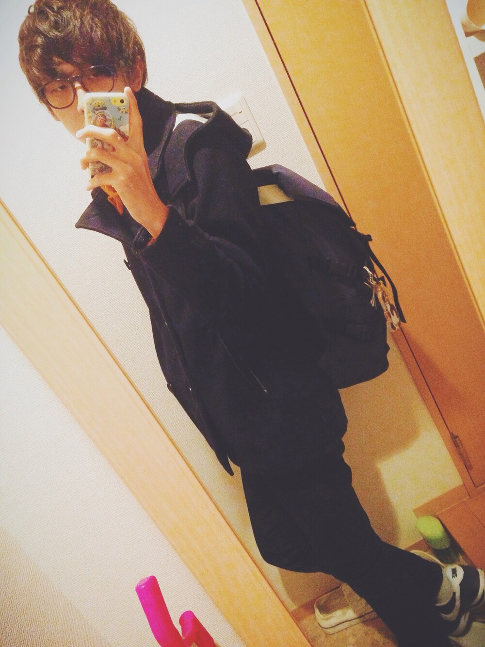 お久しぶりです! いつも見てくださっているみなさん、お待たせしました、ごめんなさい。 ここ数ヶ月、ものすごく忙しくなってしまい、服を気にしたり、写真を撮ったりする時間がなかなか取れなくなってしまっていました。 年末ということで、少し時間に余裕ができたので投稿します!よかったら見てください! 今回はメガネをかけてみました。 こちらのメガネはレンズなしです。確かだいぶ前の女性ファッション誌の付録だったと思います。 フチの色はこげ茶で、自分の髪色と同じため、使いやすいです。 服ですが、すみません、中のセーター、ピーコート、リュックのどれをメインにするか小一時間ほど迷った挙句、全部撮っちゃえみたいな感じで撮ってしまってどれも微妙にわかりにくくなってしまいました。笑 またピンで一個ずつ投稿できればと思います… もう一枚撮りだめしているので、今日か明日には投稿しますね! ではでは、バイトに行ってきます。