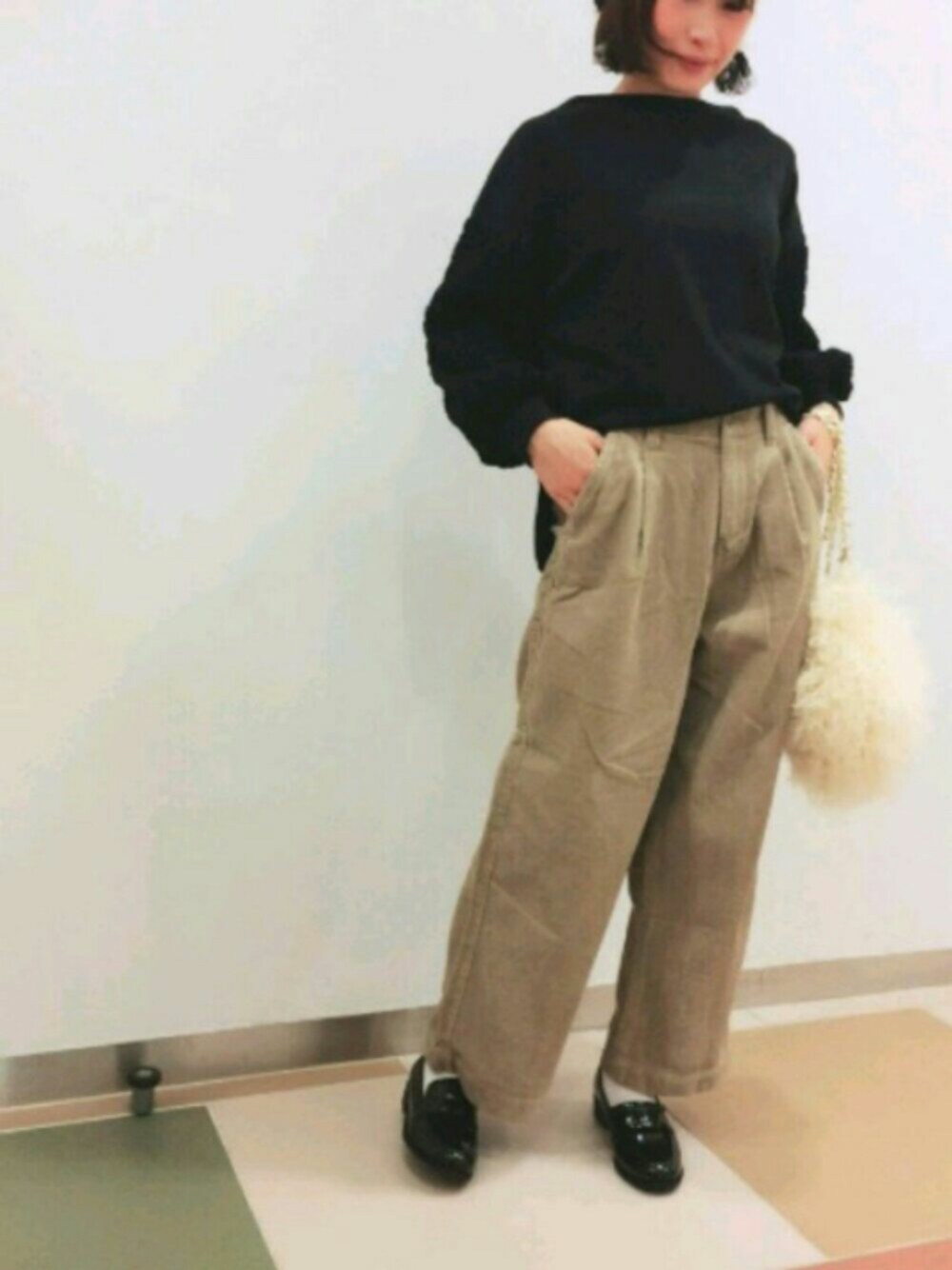 ちょっとそこまで。 ゆったりシルエットのトップスに ゆったりコーデュロイパンツ 足元はあえてローファーでかっちり 白靴下×シューズにはまってます。