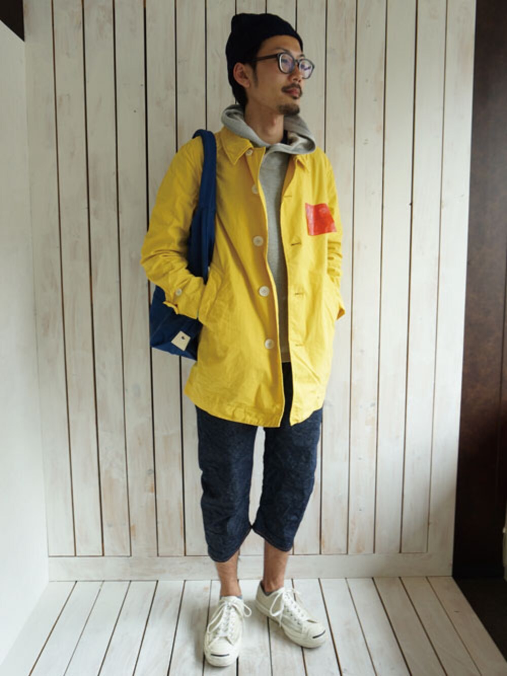 春らしい爽やかなカラーを使用したコーディネート。 目を惹く鮮やかなショップコートは、コットンポプリンの生地を使用し、 オーバーダイ(後染め)をする事により各部にシワが見られ、 既に長年着こまれたかの様な雰囲気の良い仕上がりに。 丈は長過ぎず、短過ぎずのバランスのとれた絶妙な作りになっています。 春にオススメのアイテムです! http://www.ko-store.jp/?pid=70275484 KNOCKOUT KOBE