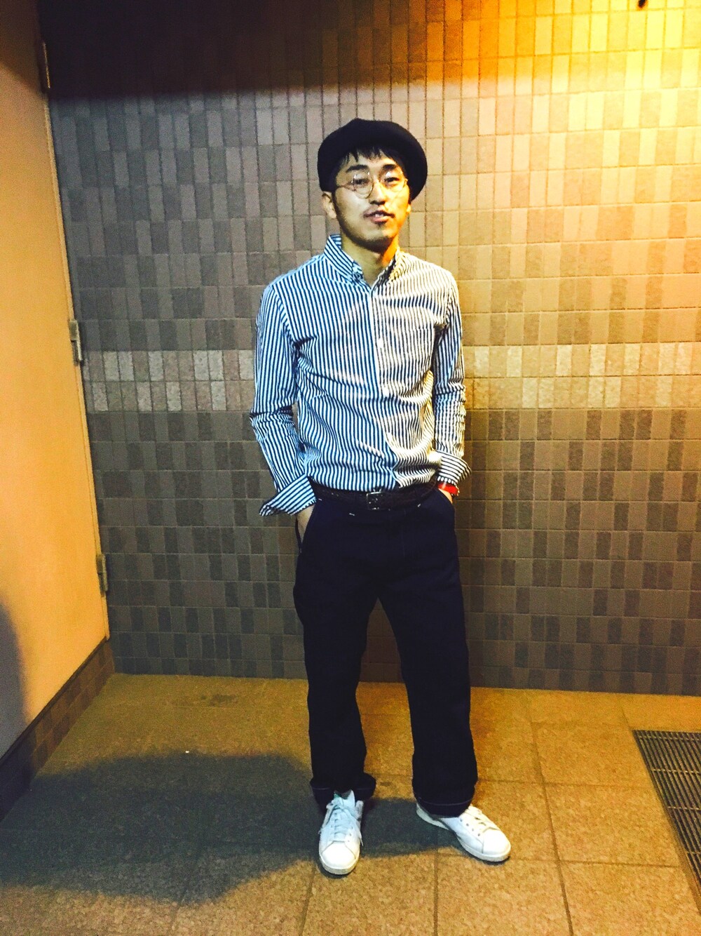 太めのデニムパンツにストライプシャツをインしてみました。帽子はoverrideで買ったベレー帽。