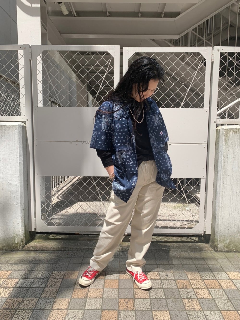 メンズの半袖シャツを羽織りました! バンダナ柄は安定の良さ!