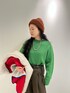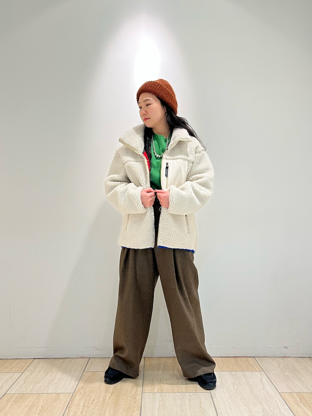 フリースと中に緑のニットを着たら冬コーデの完成。 アクティブやなシーンにはフリースが1番!
