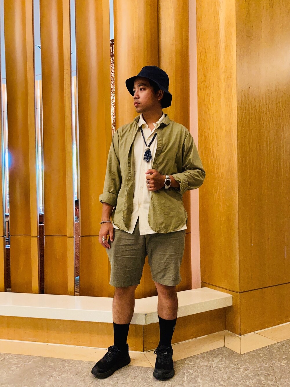 Urban outdoor ,研習會穿搭,上中下中,以綠色為主色,深藍漁夫帽與黑鞋相呼應,完成OOTD。