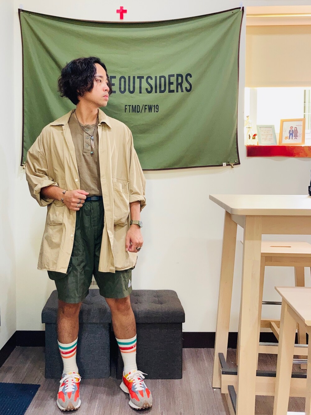 上寬長下寬短,上身採大比例對比,內搭亨利領,外搭oversized shirts ,下身則用白襪與new balance 327完成OOTD。