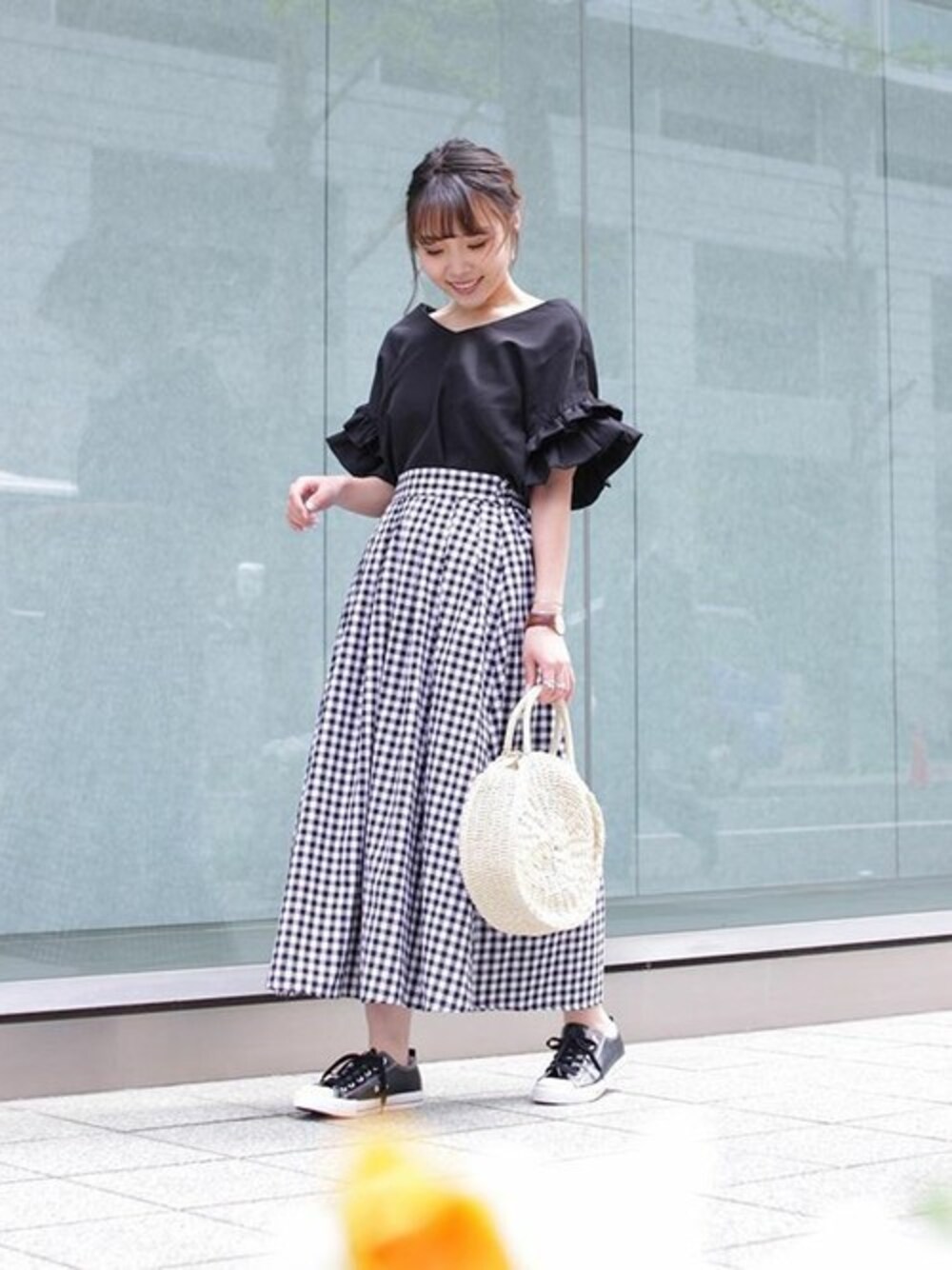 黒ブラウス着回し★コーデ1★トレンドの大好きなギンガムチェックスカートと合わせてモノトーン意識♪ ボリュームフリル袖ブラウス[C2791] ウエストリボンマキシ丈フレアスカート [M2151] 選べる2タイプ☆クリアドロップチャームピアス [J578] 【390円】ジルコニアネックレス(大) [J586] 着用アイテムから飛べない商品&ZOZOTOWNで未販売の商品は、神戸レタスのサイト内で商品ID検索が出来ます♡