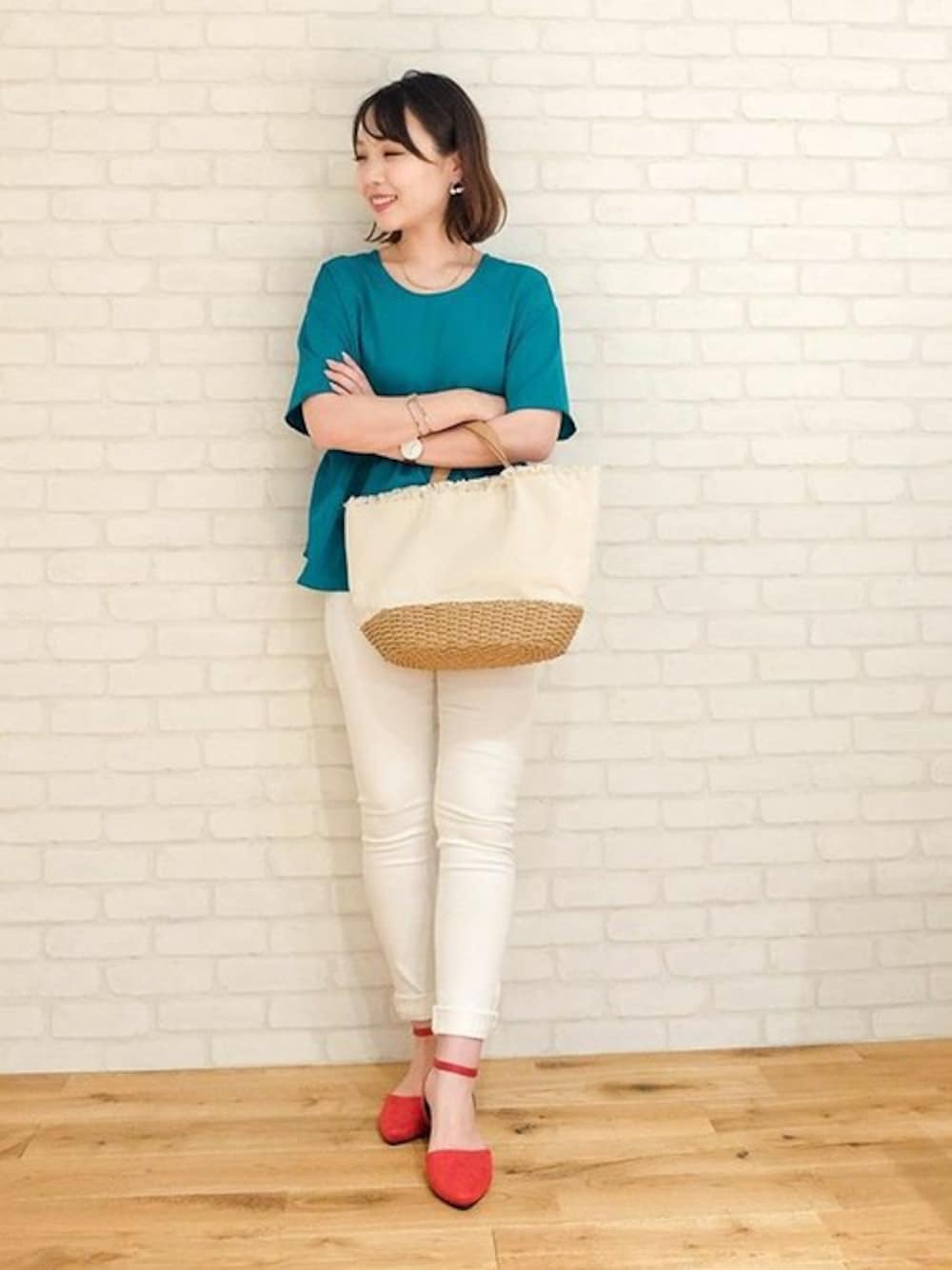 気分の上がるカラーアイテムを取り入れて♪爽やかなホワイトカラーと合わせて女性らしく♪ 選べる4type[ フレンチ袖 / フリル袖 / バルーン袖 / イレヘム ]とろみ落ち感ブラウストップス[C3307] 選べる5size☆[XS~LL]心地よい伸び感で動きやすさ抜群!ストレッチFitカラースキニーパンツ[M1931] キャンバス地×ペーパー素材トートバッグ[B1155] 足元からこなれた存在感を呼び込んで◎!アンクルストラップ☆サイドカットフラットパンプス[I1522] 着用アイテムから飛べない商品&ZOZOTOWNで未販売の商品は、神戸レタスのサイト内で商品ID検索が出来ます♡