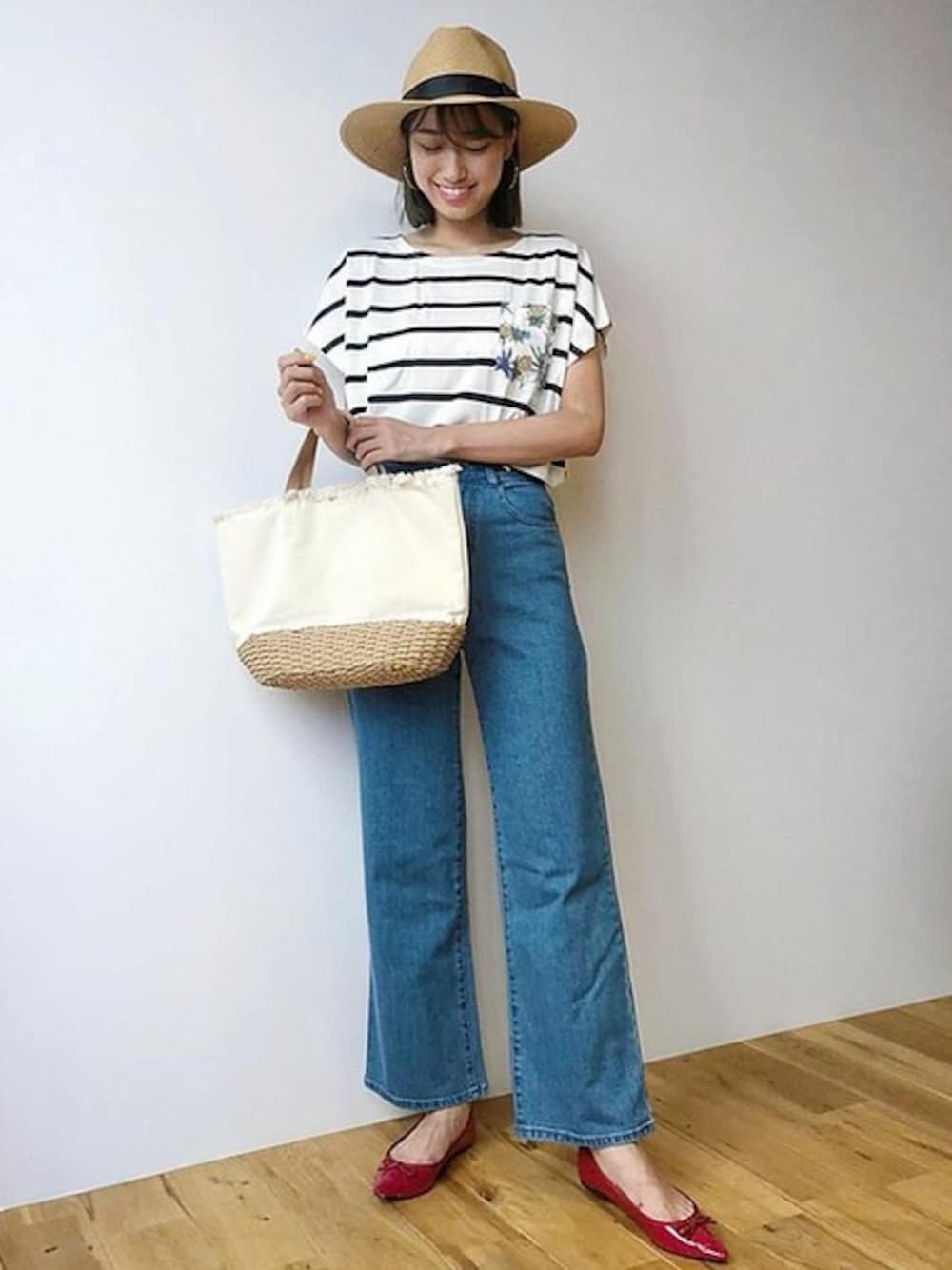 ボーダー×デニムがシーズンライクな、夏コーデ!赤のバレエパンプスをポイントに◎ 選べる柄プリントデザインゆるシルエット半袖Tシャツトップス[C2000] 美脚を演出し着回し力もバツグン!ハイウエストストレートワイドデニムパンツ[M2084] キャンバス地×ペーパー素材トートバッグ[B1155] リボンモチーフがフェミニンな装いをアシスト!軽量ポインテッドトゥバレエパンプス[I1508] 着用アイテムから飛べない商品&ZOZOTOWNで未販売の商品は、神戸レタスのサイト内で商品ID検索が出来ます♡