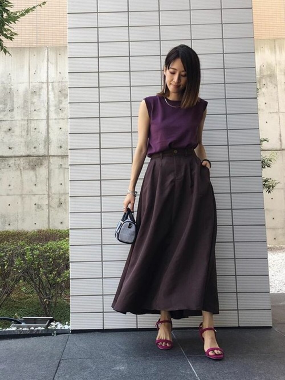 パープル×ブラウン配色の秋先取りコーディネート。素材は涼しいから今から着れますよ。 クルーネックノースリーブニットトップス[C3404] 前開きロングフレアスカート[M2239] 6cmヒール ★ アンクルストラップ ★シンプルサンダル[I1557] 着用アイテムから飛べない商品&ZOZOTOWNで未販売の商品は、神戸レタスのサイト内で商品ID検索が出来ます♡