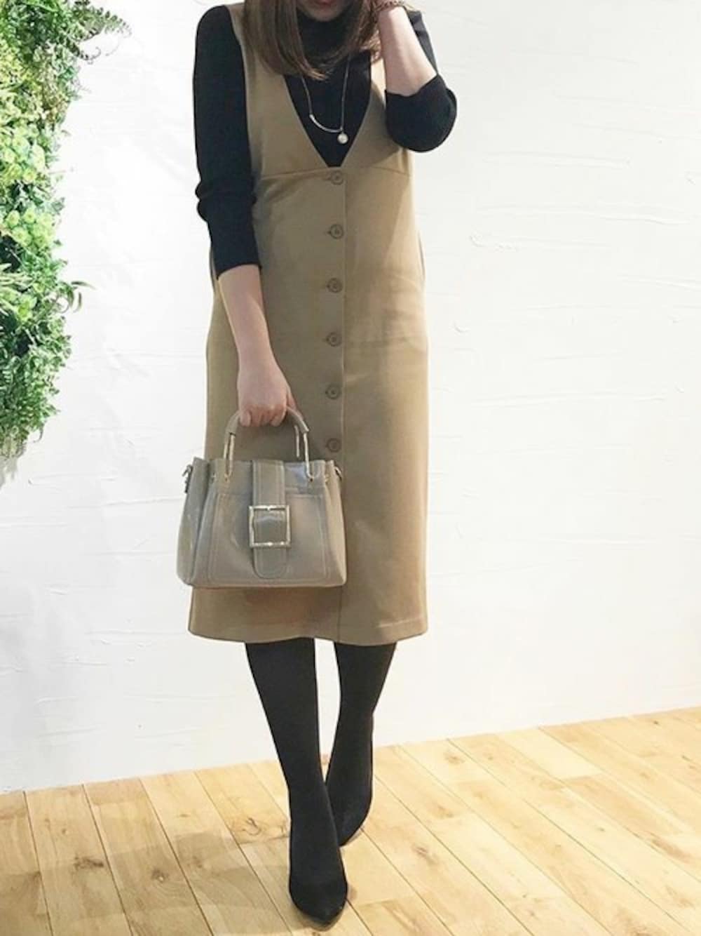大人もトライしやすいジャンパースカートコーデ♪ ポンチVネックジャンスカ [E1978] 長袖リブタートルネックニット [C2420] メタルハンドルバッグ [B1229] 機能系7cmポインテッドトゥパンプス[I1150] 着用アイテムから飛べない商品&ZOZOTOWNで未販売の商品は、神戸レタスのサイト内で商品ID検索が出来ます♡